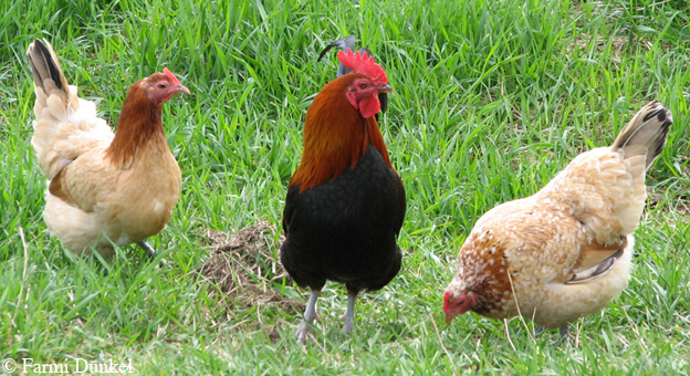 Kanat Helmi, Rosa ja Siiri sekä kukko Paroni 23.6. >>